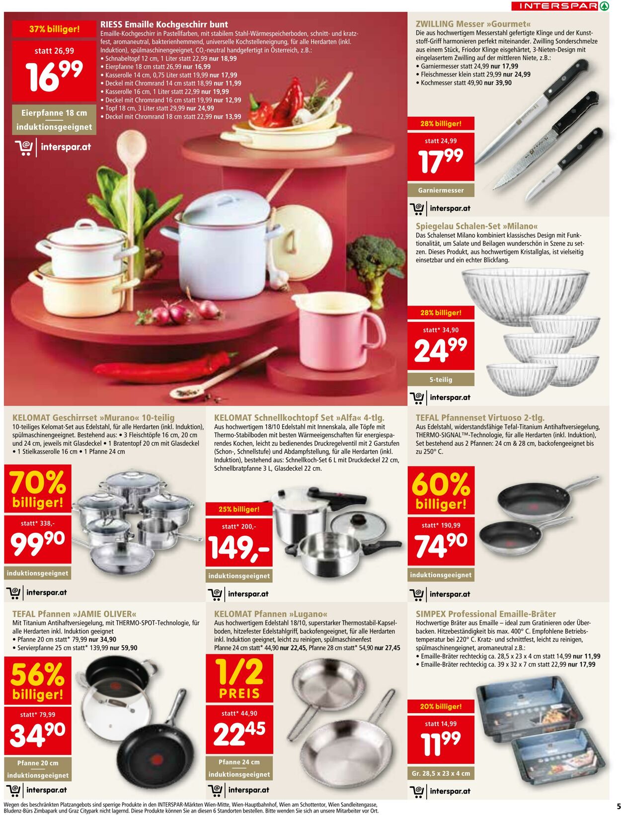 ZWILLING Messer »Gourmet« Die aus hochwertigem Messerstahl gefertigte Klinge und der Kunst- stoff-Griff harmonieren perfekt miteinander. Zwilling Sonderschmelze ‘aus einem Stick, Friodor Klinge eisgehairtet, 3-Nieten-Design mit eingelasertem Zwilling auf der mittieren Nite, 2.B.: '* Garniermesser statt 24,99 nur 17,99 + Fleischmesser klein statt 29,99 nur 24,99, * Kochmesserstatt 49,90 nur 39,90 UATE AEM craliea lS EmailleKochgeschirin Pastelifarben, mit stabilem Stahl-Warmespeicherboden, schnitt- und kratz- ra eae Sauer Pacer e) oe * Kasserolle 14 cm, 0,75 Lite r ries eeu) Pre corn Bip aC] Ca Clet Tce g Ces “1QI| interspar.at Spiegelau Schalen-Set »Milano« Das Schalenset Milano kombiniert klassisches Design mit Funk- tionaltat, um Salate und Beilagen wunderschén in Szene zu set zen, Dieses Produkt, aus hochwertigem Kristallglas,istvelseitig einsetzbar und ein echter Blickfang. Te) | interspar.at KELOMAT Geschirrset »Muranox 10-teilig KELOMAT Schnellkochtopf Set »Alfa« 4-tlg. TEFAL Pfannenset Virtuoso 2-tlg. iliges Kelomat-Set aus Edelstahl fur alle Herdarten (inkl. Induktion), spilmaschinengeeignet. Bestehend aus: « 3 Fleischtdpfe 16 cm, und 24 cm, jeweils mit Glasdeckel » 1 Bratentopf 20 cm mit Glasdeckel +1 Stielkasserolle 16 cm # 1 Pfanne 24 cm ‘Aus hochwertigem 18/10 Edelstaht mit innenskala, alle Tépfe mit Thermo-Stabilboden mit besten Warmeeigenschaften fr energiespa- rendes Kochen, leicht zu bedienendes Druckregelventi mit 2 Garstufen (Schon-, Schnellstufe) und Abdampfstellung, fur alle Herdarten (inkl Se aR EET aE ETT ‘THERMO-SIGNAL™-Technologie, fiir alle He (inkl. Induktion), Set bestehend aus 2 Pfannen: 24 cm & 28 a LeclanecGar bis zu 250° Induktion), bestehend aus: Schnellkoch-Set 6 L mit Druckdeckel 22 cm, Schnellbratpfanne 3 L, Glasdeckel 22 cm. Prue ee ae 2| interspar.at Peers 12| interspar.at eee 2 interspar.at TEFAL Pfannen »JAMIE OLIVER« Mit Titanium Antihaftversiegelung, mit THERMO-SPOT-Technologie, fir alle Herdarten inkl. Induktion geeignet + Pfanne 20 cm statt” 79,99 nur 34,90 * Servierpfanne 25 cm statt* 139,99 nur 59,90 KELOMAT Pfannen »Lugano« ‘Aus hochwertigem Edelstahl 18/10, superstarker Thermostabil-Kapsel- boderhitzefsterEdeltahg bacoengeignet fr ale Heraten_bacenHzebestndget imax. 0". Enpfblene Betis inkl. Induktion geeignet, leicht 2u reinigen, spiilmaschin temperatur bei 220° C. Kratz- und schnitfes, leicht zu reinigen, Pfanne 24cm sat” 44,90 nur 2245, rane 28cm stat 5490 nur 27,45 spmaschinengegne,aromaneutal 8: ‘© Emaille-Brater rechteckig ca. 28,5 x 23 x 4 cm stat 14,99 nur 11,99 Z + Emaille-Braterrechteckig ca. 39 x 32 x 7 cm statt 22,99 nur 17,99 SIMPEX Professional Emaille-Brater Hochwertige Brater aus Emaille — ideal zum Gratinieren oder Uber- eure 4 Cree ee ae x interspar.at ener Cree ee 2| interspar.at 12| interspar.at Wegen Si Produkte in den E {, Wien am Schottentor, it A ce shri Pez Sd serge Prt in a NTERSPAR aero iene, Wr taupe, Wi op schotterton en Sancteongess